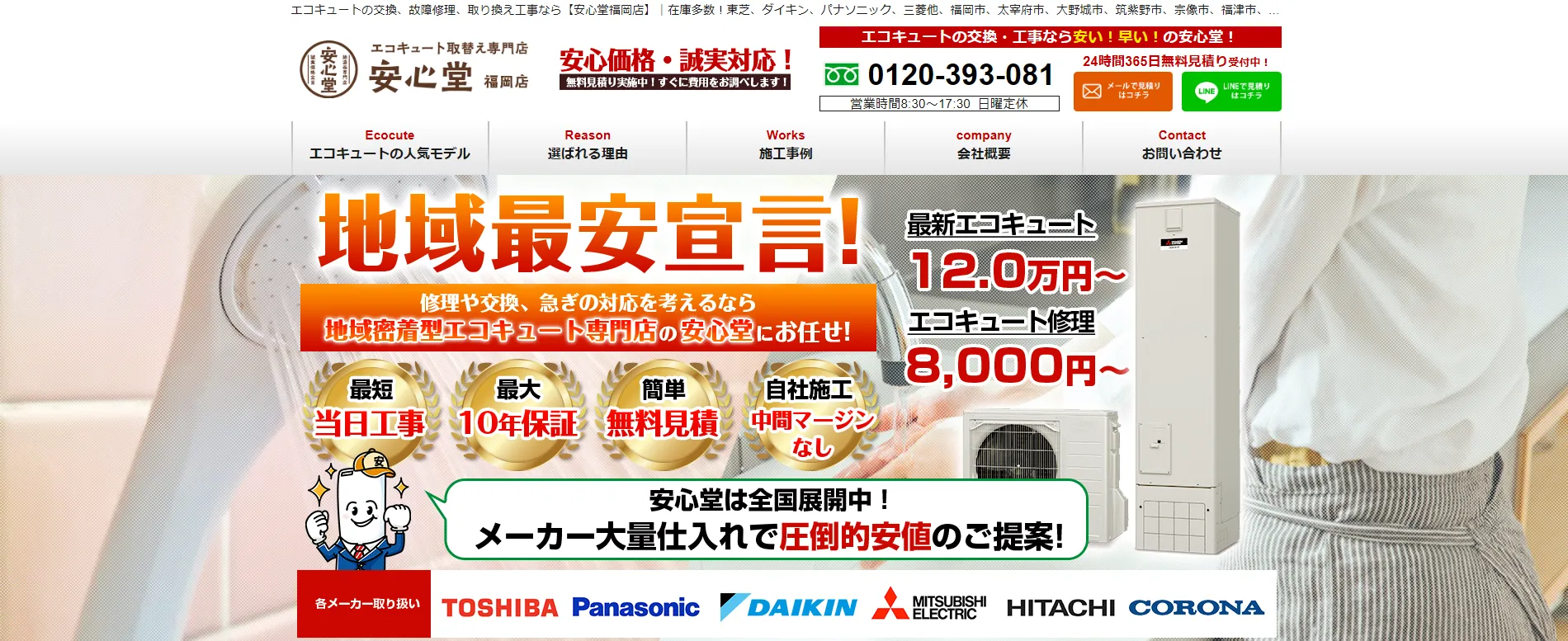 久留米市の実家で給湯器を交換しました。高額になるかと心配でしたが、複数社の見積もりを比較した結果、価格と対応のバランスでこちらに決定。