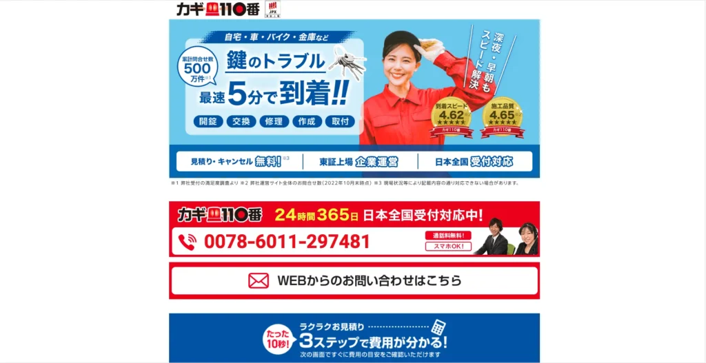 駆け付け目安依頼後最短5分〜で現場到着可能(状況により変動)