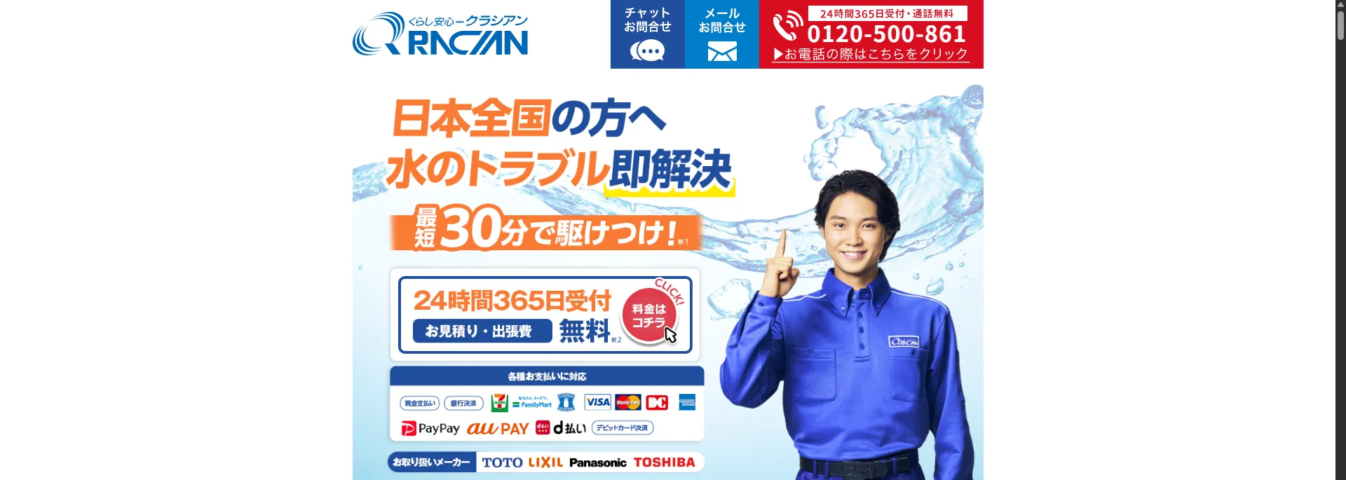 出張見積りは最短当日可で、実際の工事は契約後最短2日~となっています。Googleの口コミ評価は4.8と非常に高く、ベテランスタッフのスピーディーで丁寧な対応に定評があります。 支払方法はクレジットカード(前払い)のほか、コンビニ決済・銀行振込・NP後払い(後払い)などライフスタイルに合わせて柔軟に選択可能です。