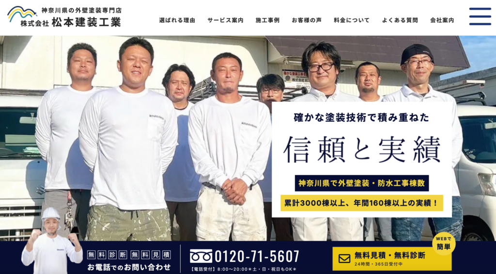 サービス内容外壁塗装⼯事、屋根塗装⼯事、防⽔⼯事、シーリング⼯事、リフォーム⼯事など