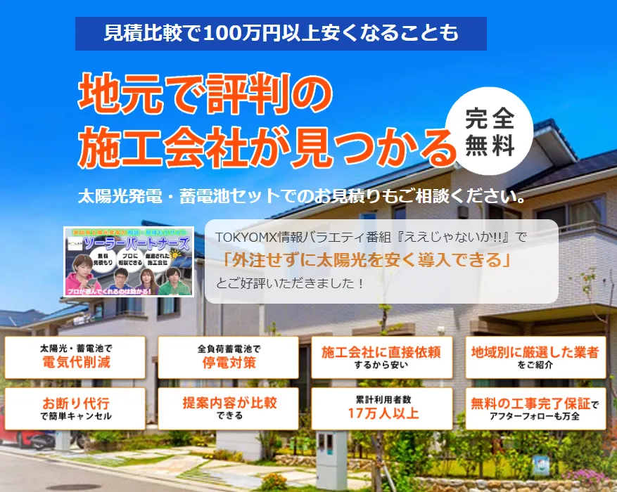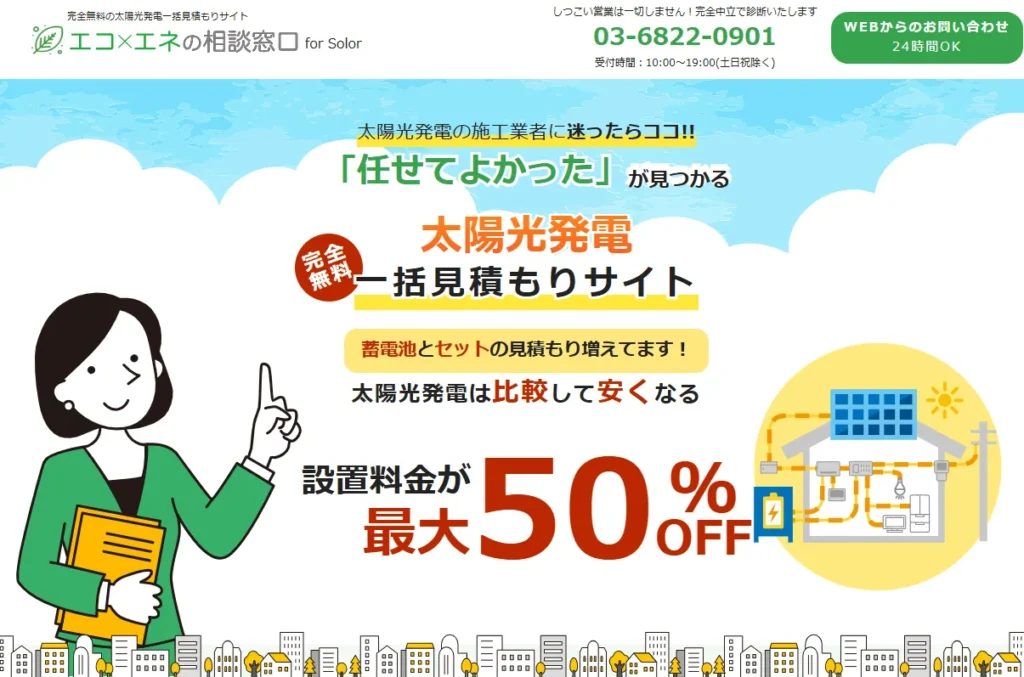 | サービス名 | ![]() ![]() エコ×エネの相談窓口 【総合評価No.1】 | ![]() ![]() ソーラーパートナーズ | ![]() ![]() タイナビ |