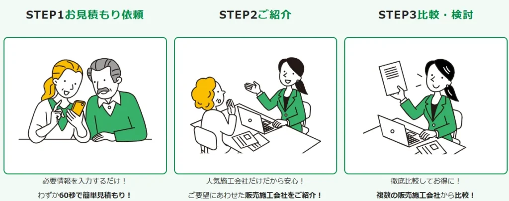 | 強み | ・補助金込みの総額比較ができる ・大阪府内対応の施工会社を紹介 ・営業色が比較的弱く相談しやすい | ・審査を通過した施工店のみ紹介 ・強引な営業が少ない ・工事完了保証あり | ・最大5社の一括見積もり ・価格比較に強い ・業界老舗の比較サービス |