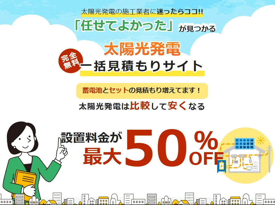 | 向いている人 | ・初めて太陽光発電を検討する人 ・業者選びで失敗したくない人 | ・施工品質・安心感を重視したい人 ・訪問販売が不安な人 | ・とにかく価格を比較したい人 ・相見積もりに慣れている人 |