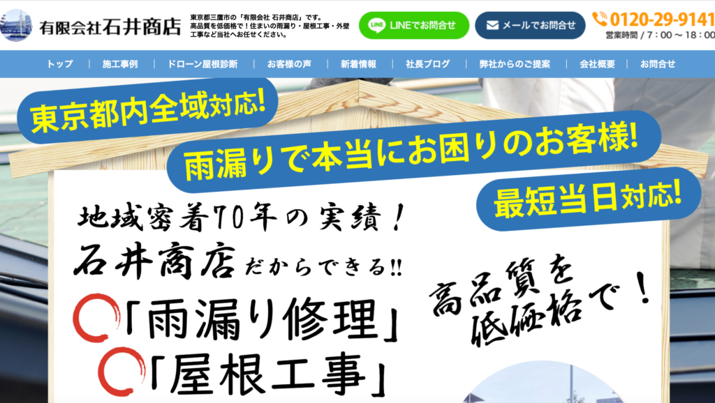 最短即日対応が可能なため、突然の雨漏りや台風後のトラブルにも迅速に対応してもらえるのが強みです。