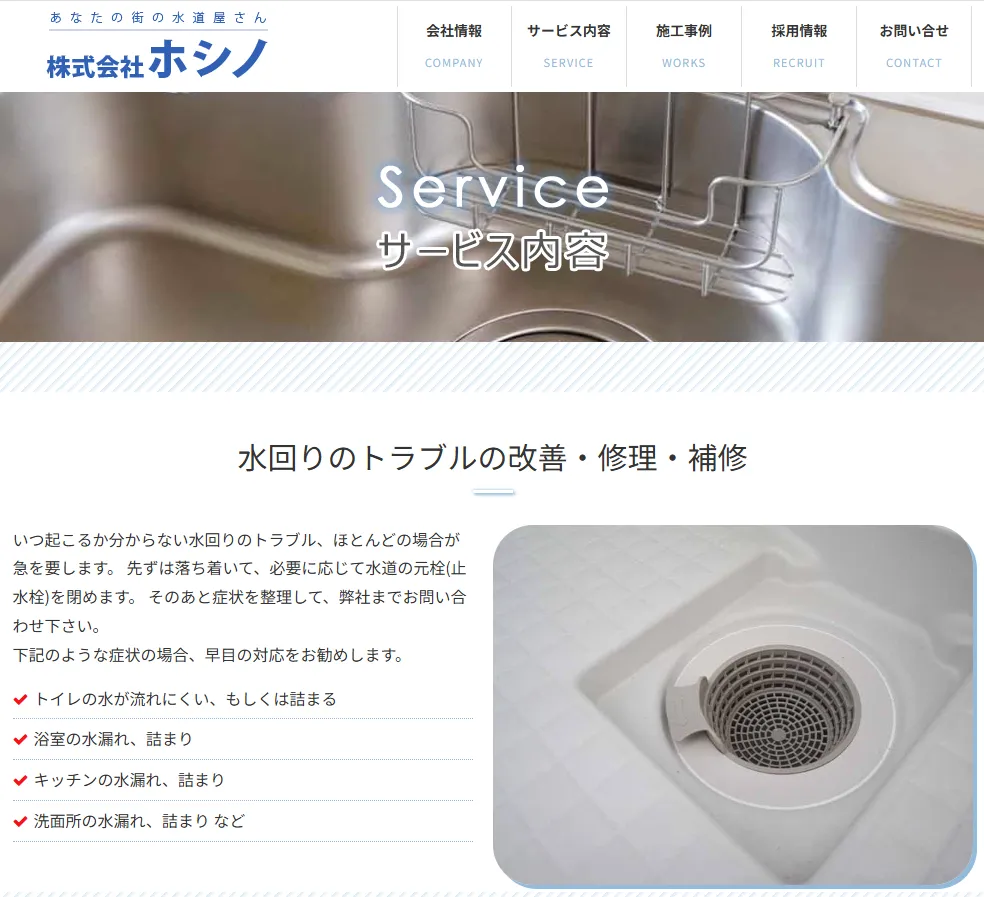 | サービス内容 | トイレ、キッチン、風呂・浴室・洗面台・洗濯機置場の水漏れ・つまりの解消。故障対応などの水廻り・水トラブル。全般上下水道工事、舗装工事、水回りリフォーム、衛生設備工事 |