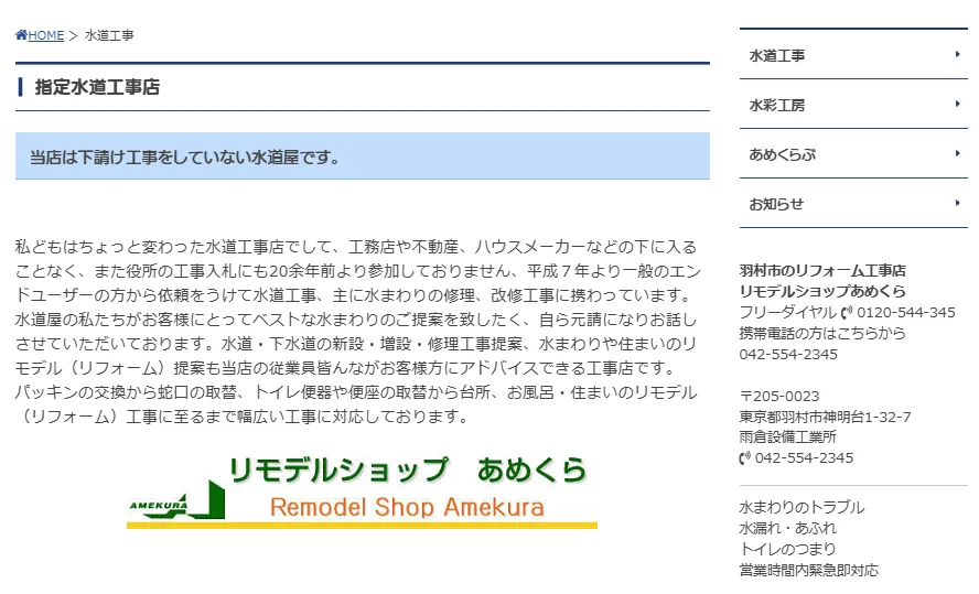 | サービス内容 | トイレ詰まり、トイレ水漏れ、キッチン詰まり、キッチン水漏れ、お風呂詰まり、お風呂水漏れ、洗面化粧台の蛇口水漏れなどの水道トラブル・水回りトラブル全般。管工事業(空調工事含む)、消防施設工事業(第一類)、水道施設工事業、浄化槽工事業、メンテナンス・一般住宅新築工事、上記工事の施工及び設計監理 |