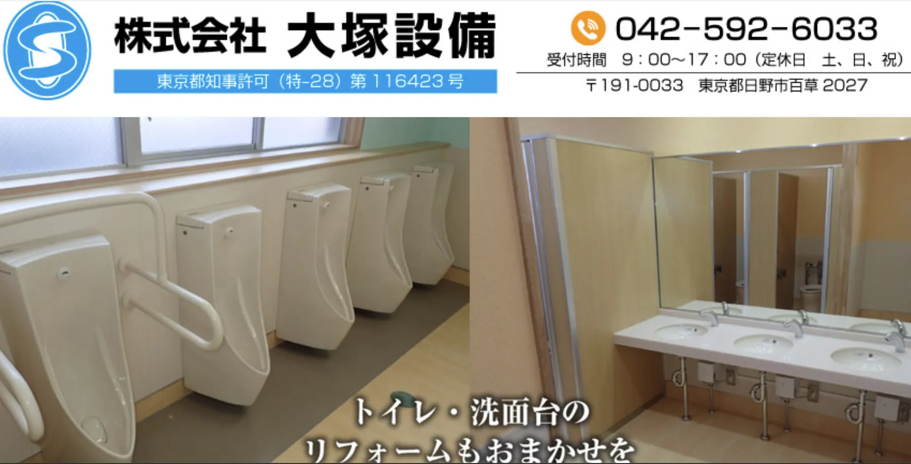 | サービス内容 | トイレ詰まり、トイレ水漏れ、キッチン詰まり、キッチン水漏れ、お風呂詰まり、お風呂水漏れ、洗面台の蛇口水漏れなどの水道トラブル・水回りトラブル全般。給排水配管工事、衛生機械設備工事、空調設備工事、水道施設工事、舗装工事、土木工事、水まわりのリフォーム・修理、下水道施設修繕工事(マンホール維持補修工事<パラボラ工法>等) |
