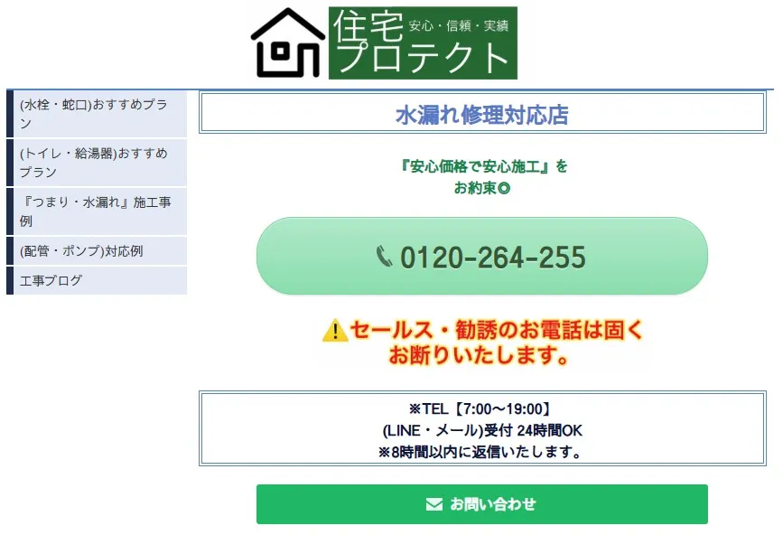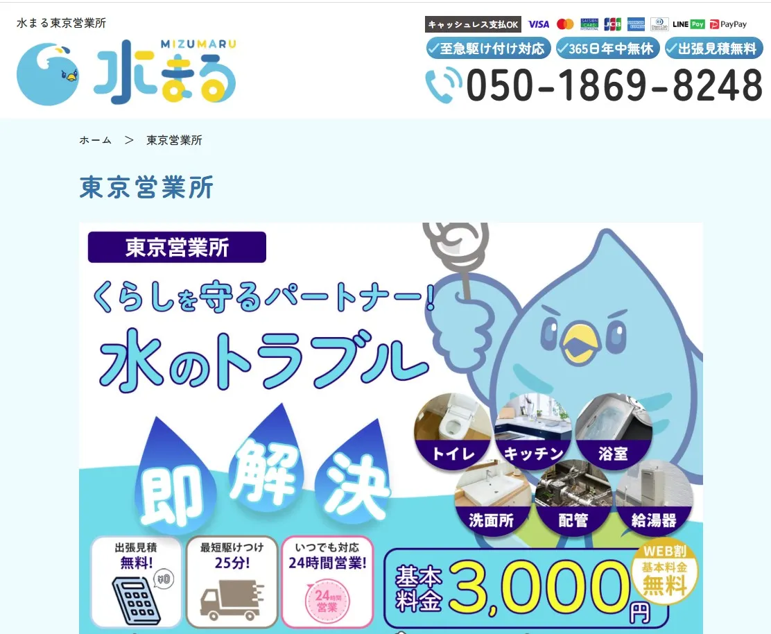 | サービス内容 | トイレ・浴室・キッチン・洗面所・洗濯所・屋外のつまりや水漏れ修理・排水口、排水管の異臭、高圧洗浄・便器内つまり異物除去・蛇口水漏れに伴う部品交換など |