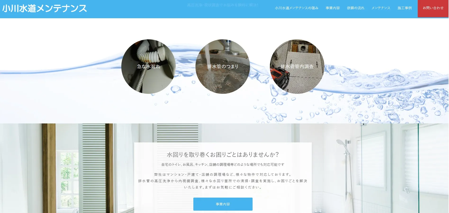 トイレや浴室、キッチン、洗面所など住宅のあらゆる水トラブルに対応しています。