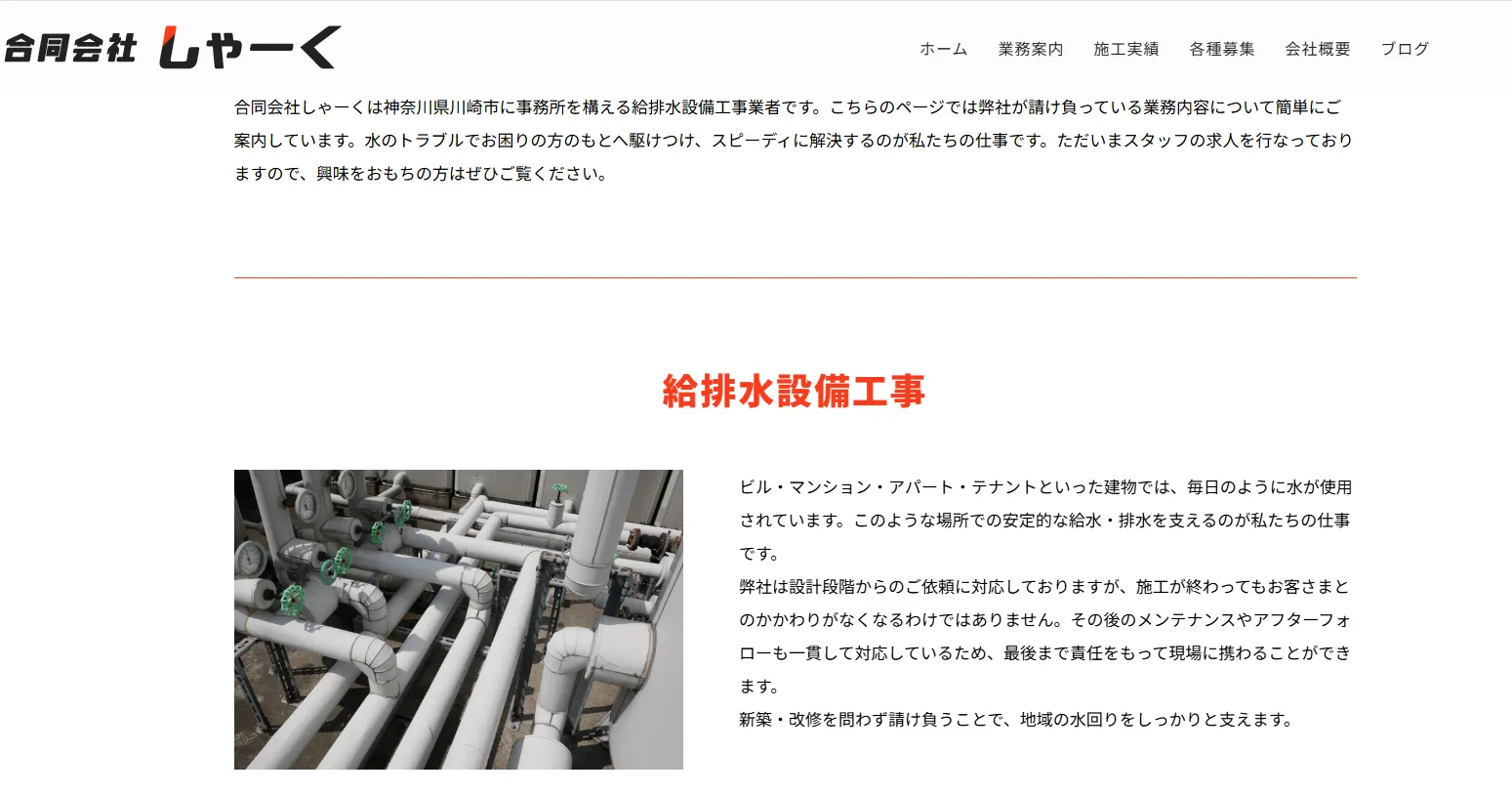 | サービス内容 | トイレ詰まり、トイレ水漏れ、キッチン詰まり、キッチン水漏れ、お風呂詰まり、お風呂水漏れ、洗面台の蛇口水漏れなどの水道トラブル・水回りトラブル全般。給排水設備工事(上下水道引き込み・室内配管・下水道排水・浄化槽設置) |