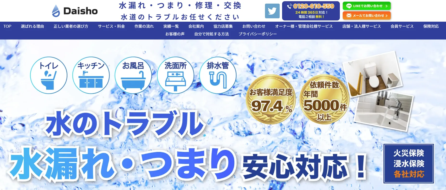トイレや浴室、キッチン、洗面所など住宅のあらゆる水トラブルに対応しています。