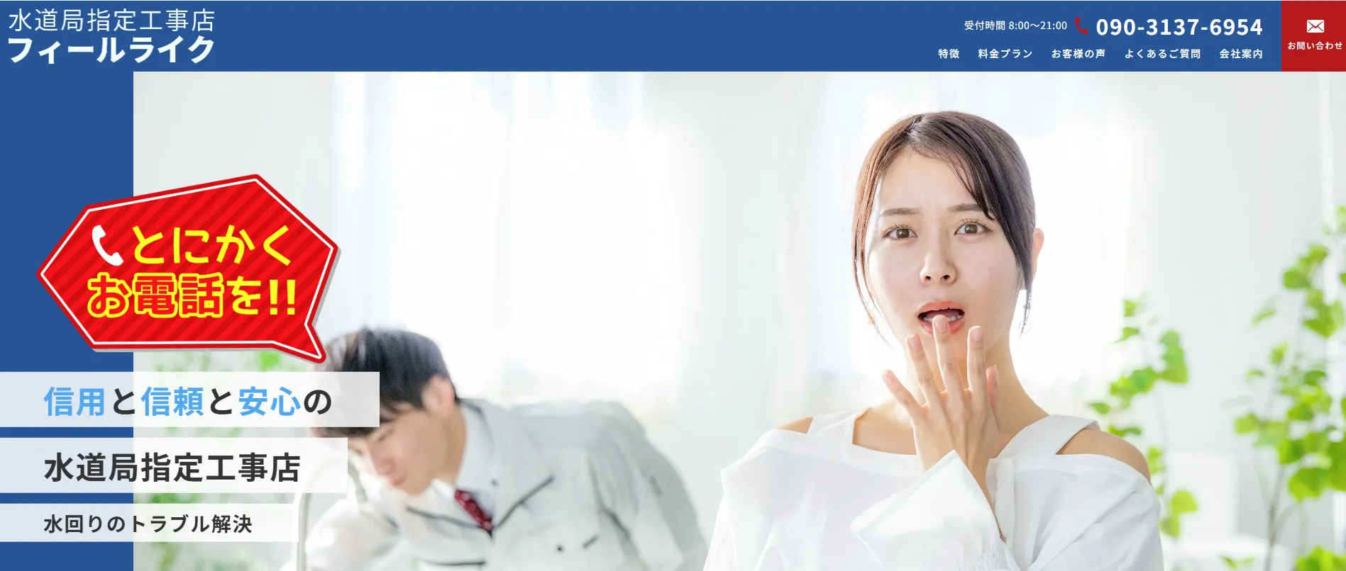 | サービス内容 | トイレ・浴室・キッチン・洗面所・洗濯所・屋外のつまりや水漏れ修理・無料点検・ゴムパッキンの交換、ボルトの締め直しなどの軽作業・つまり解除、薬品洗浄・蛇口の取付など |