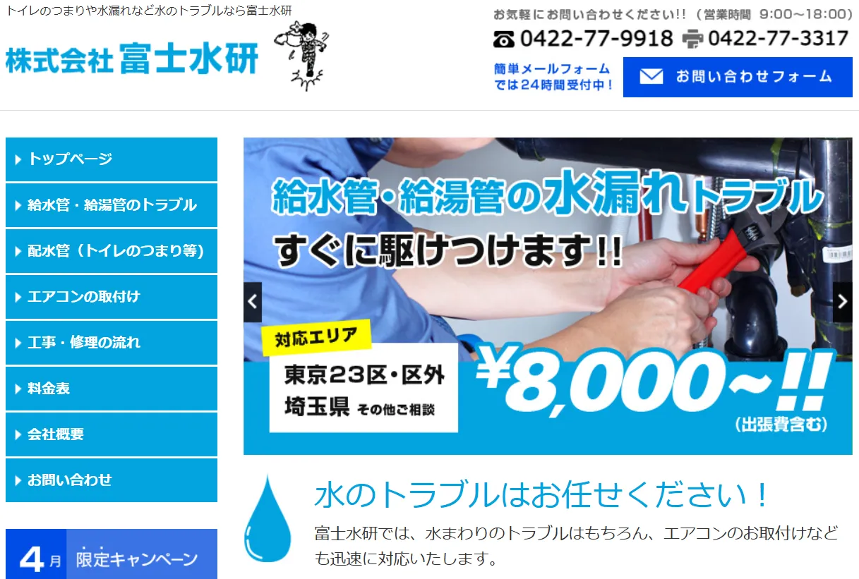 FUJISUI(フジスイ)は、東京は三鷹市をはじめ、千葉、埼玉エリア対応の水トラブル専門業者。