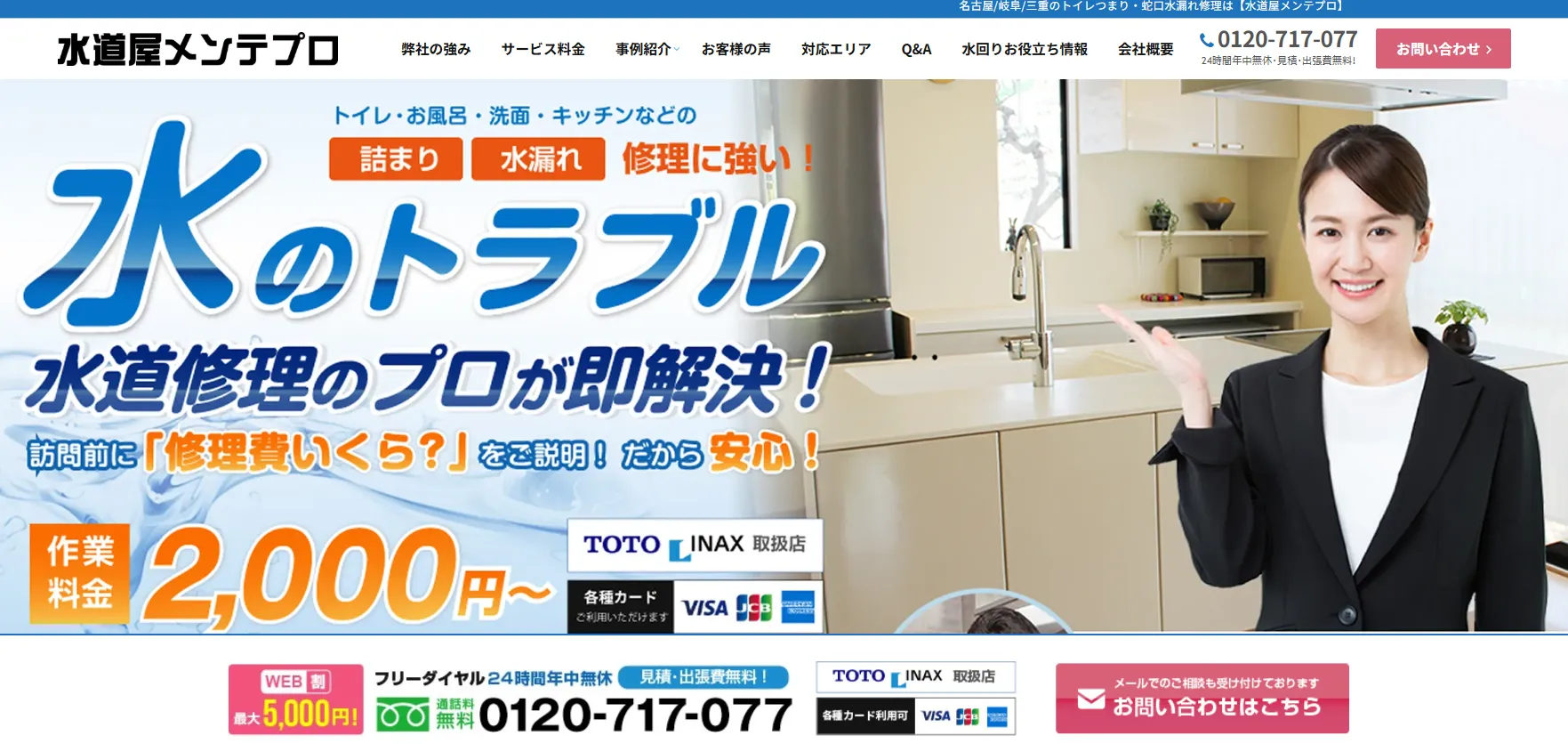| サービス内容 | トイレ・浴室・キッチン・洗面所・洗濯所・屋外のつまりや水漏れ修理・無料点検・ゴムパッキンの交換、ボルトの締め直しなどの軽作業・つまり解除、薬品洗浄・蛇口の取付など |