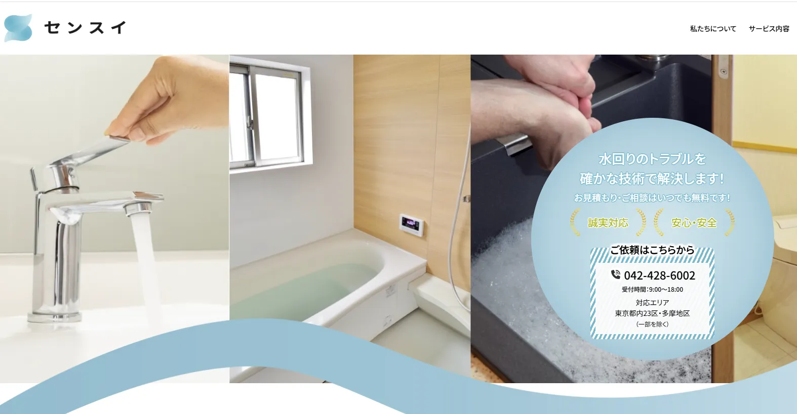 | サービス内容 | トイレ・キッチン・風呂・洗面所・洗濯機の蛇口の水漏れ、排水口のつまり修理などの水トラブル全般に対応。お風呂のリフォーム、急な水道の故障、新しいキッチンへの交換、トイレの交換、洗面所の改修、給湯器の点検。 |