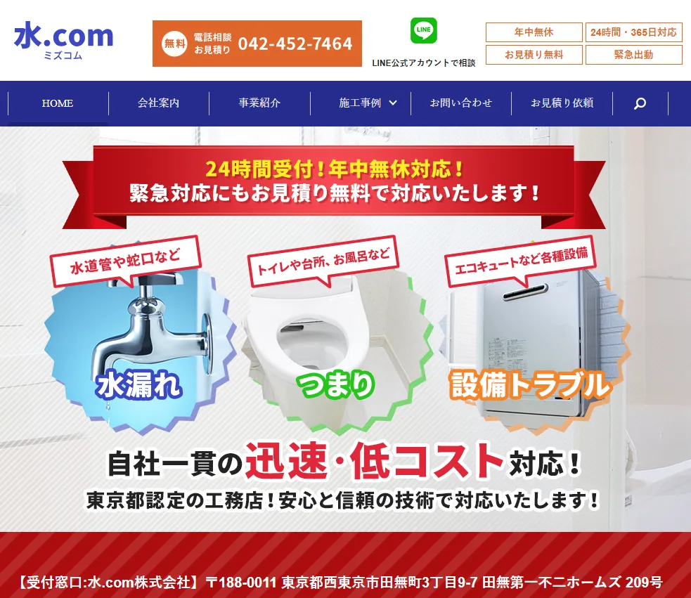 | サービス内容 | トイレ、キッチン、風呂、洗面所の水漏れ・つまりの解消。水トラブル全般。排水管高圧洗浄、排水詰まり修理、排水管内 内視鏡カメラ調査、漏水箇所不明の漏水(調査)、配管修理(調査)、屋外排水マス交換、給排水ポンプ交換 |