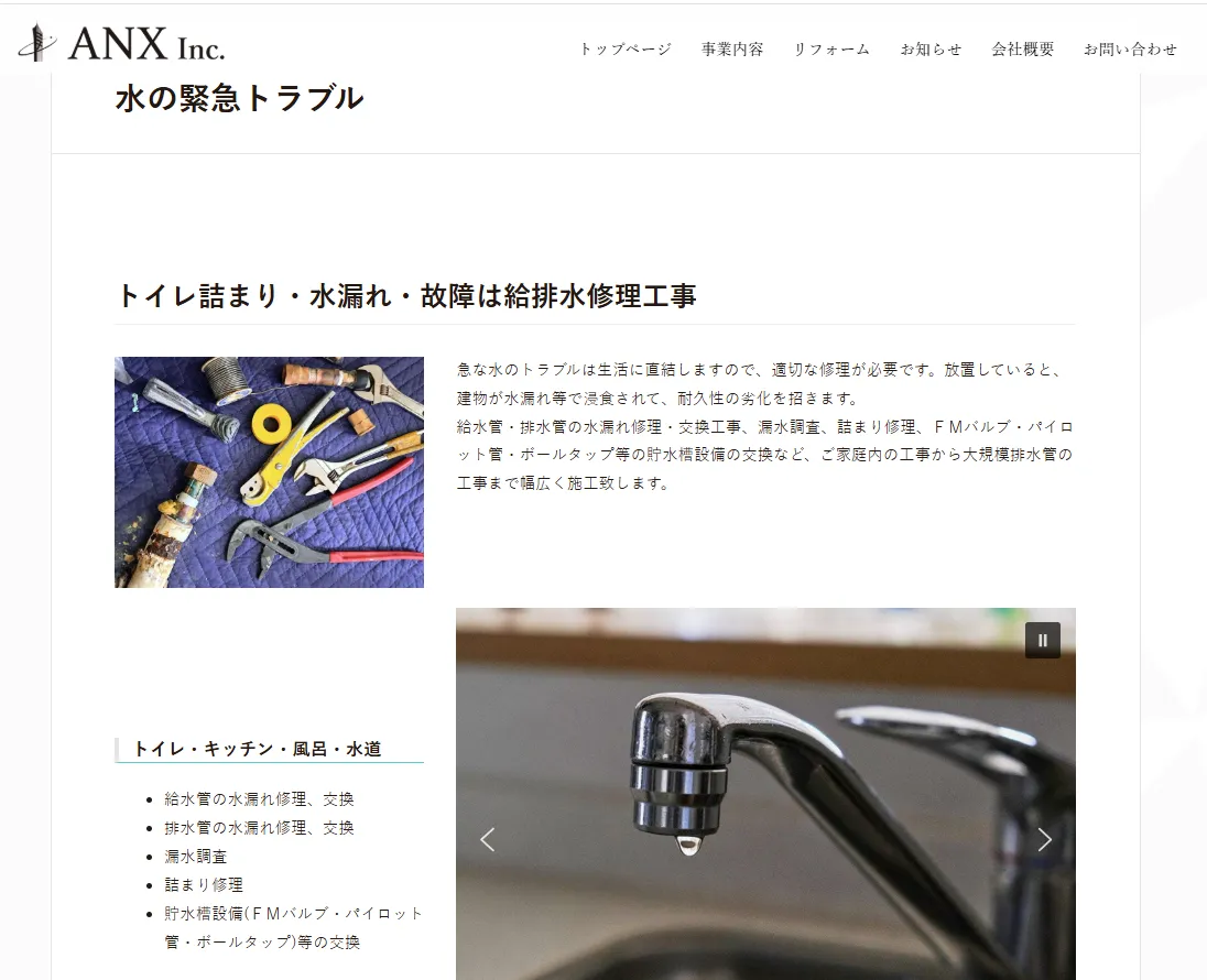 トイレや浴室、キッチン、洗面所など住宅のあらゆる水トラブルに対応しています。