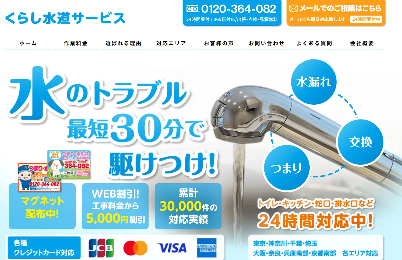 トイレや浴室、キッチン、洗面所など住宅のあらゆる水トラブルに対応しています。