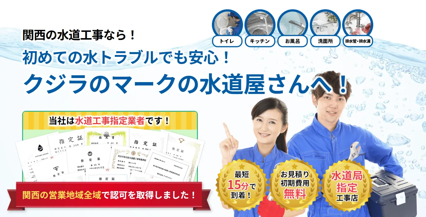 クジラのマークの水道屋さんは、株式会社アイディラインが運営する関西エリア(大阪、京都、兵庫、奈良、滋賀、和歌山)の水道修理業者です。