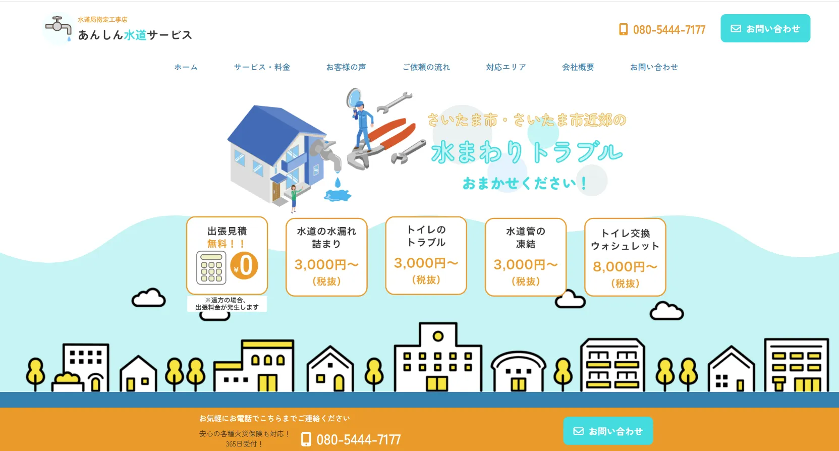 サービス内容トイレのつまり・水漏れトラブル、蛇口のトラブル、給湯器・ポンプのトラブル、排水管・排水溝のつまり・水漏れトラブル、洗面所の詰まり、水漏れトラブル、お風呂・シャワーのつまり・水漏れトラブル、キッチン・シンクの詰まり、水漏れトラブル