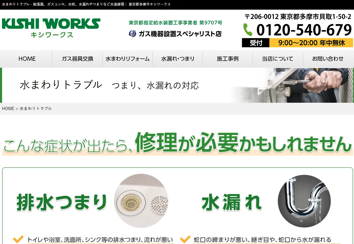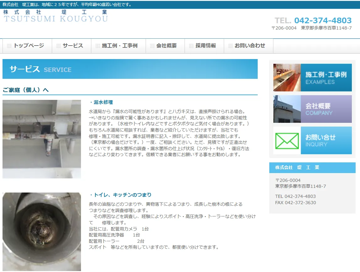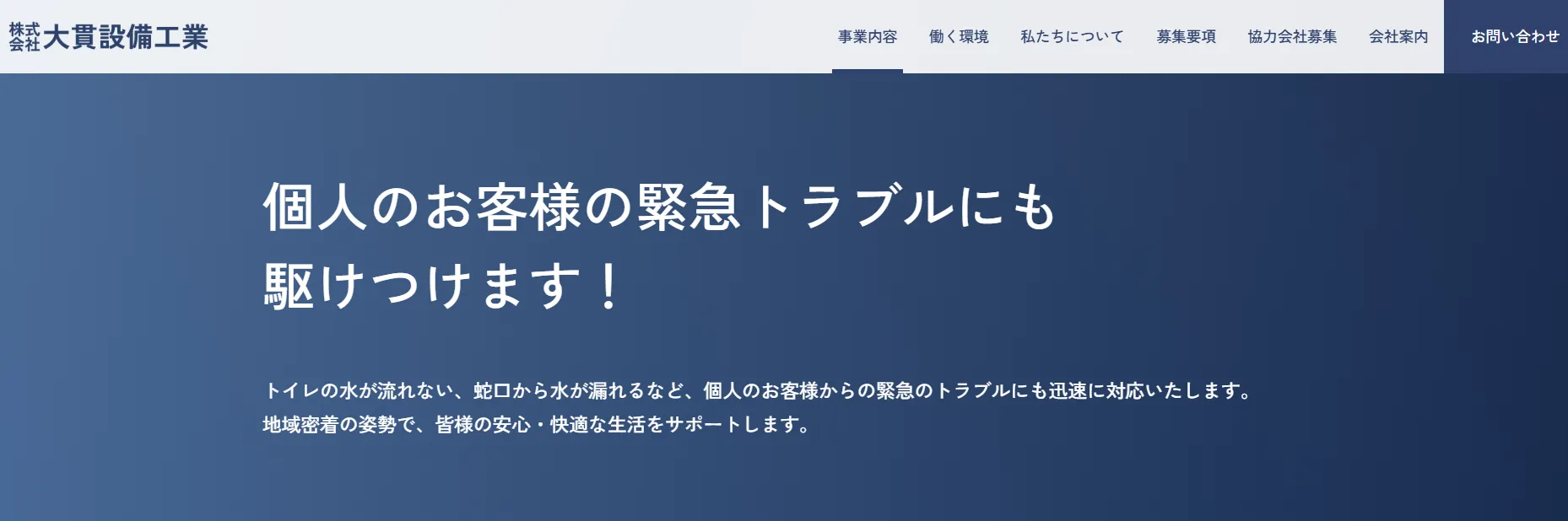 | サービス内容 | トイレ詰まり、トイレ水漏れ、キッチン詰まり、キッチン水漏れ、お風呂詰まり、お風呂水漏れ、洗面台の蛇口水漏れなどの水道トラブル・水回りトラブル全般。給排水設備の設計、施工、公共施設の改修工事、老朽化した設備の更新やメンテナンス |