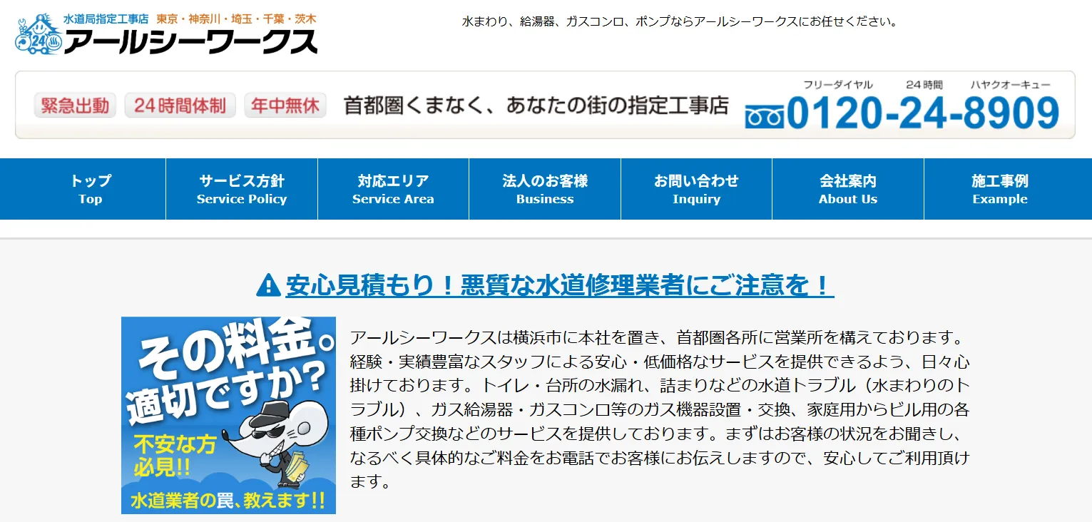 | サービス内容 | トイレ詰まり、トイレ水漏れ、キッチン詰まり、キッチン水漏れ、お風呂詰まり、お風呂水漏れ、洗面化粧台の蛇口水漏れなどの水道トラブル・水回りトラブル全般。排水・下水、清掃作業、漏水調査、取付工事 |