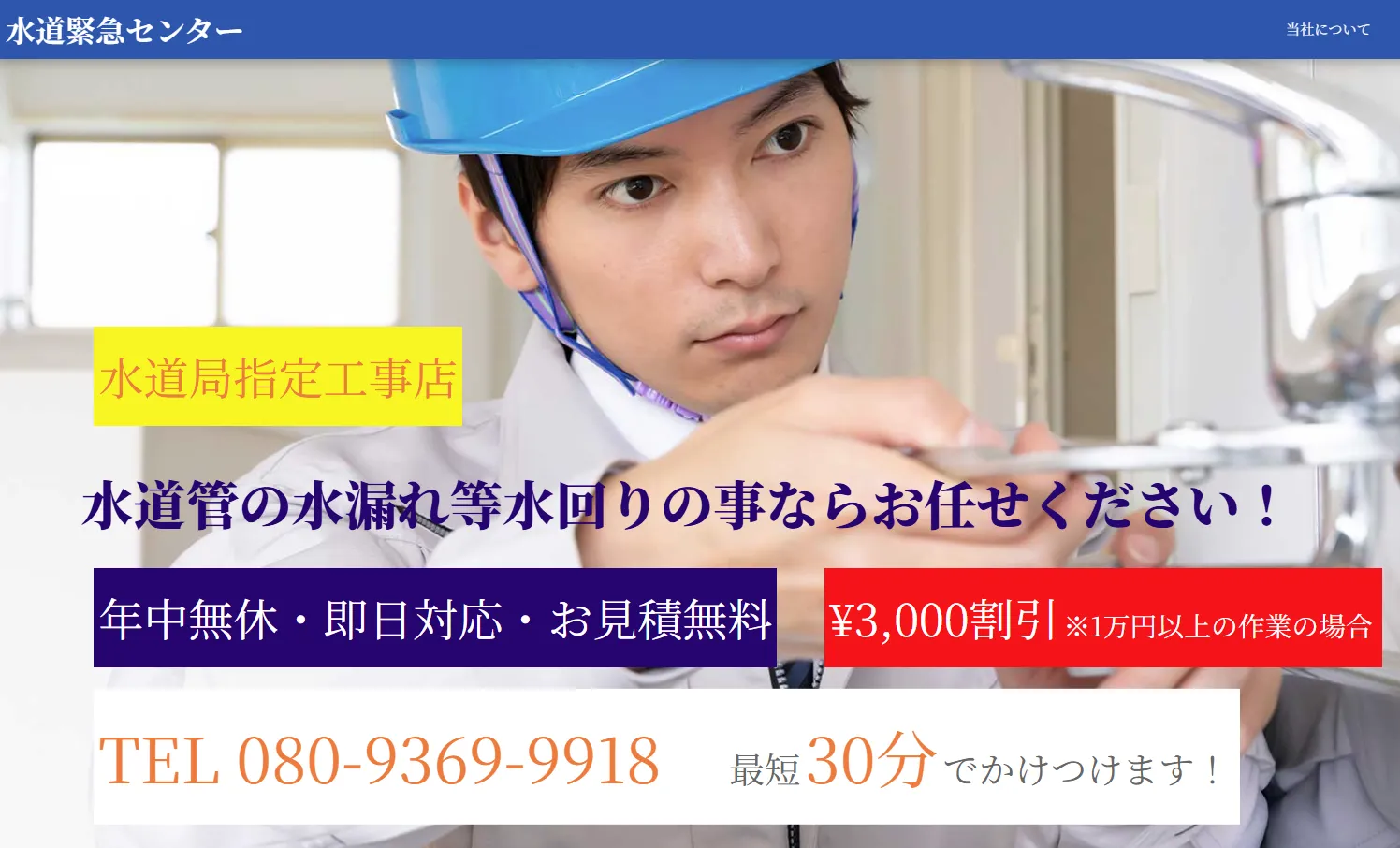 | サービス内容 | トイレ詰まり、トイレ水漏れ、キッチン詰まり、キッチン水漏れ、お風呂詰まり、お風呂水漏れ、洗面化粧台の蛇口水漏れなどの水道トラブル・水回りトラブル全般。蛇口の修理・交換、漏水調査・工事、水道管の修理 |
