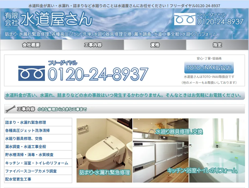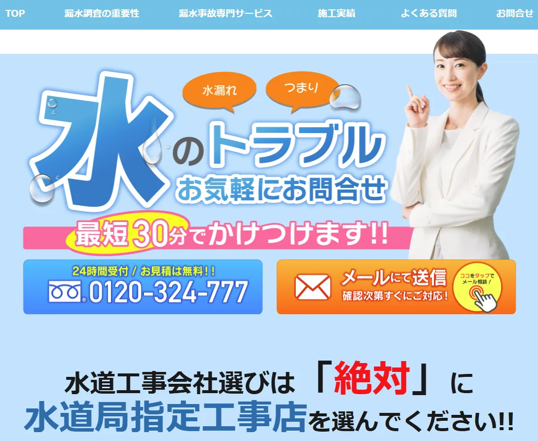 サービス内容トイレ詰まり、トイレ水漏れ、キッチン詰まり、キッチン水漏れ、お風呂詰まり、お風呂水漏れ、洗面化粧台の蛇口水漏れなどの水道トラブル・水回りトラブル全般。詰まり・水漏れ緊急修理、各種高圧ジェット洗浄清掃、水廻り器具修理、交換、漏水調査・水道工事全般、貯水槽清掃・消毒・水質検査、キッチン・浴室・トイレのリフォーム、ファイバースコープカメラ調査、配水管更生工事